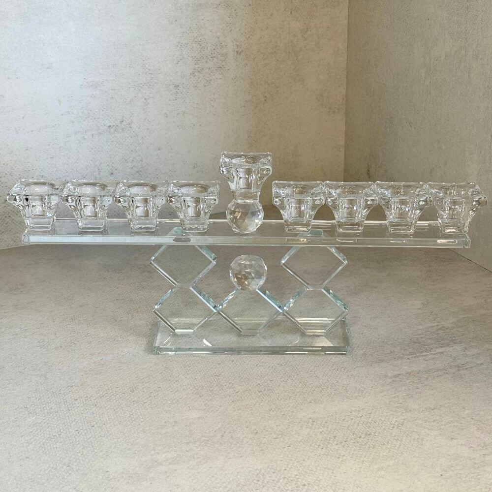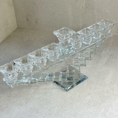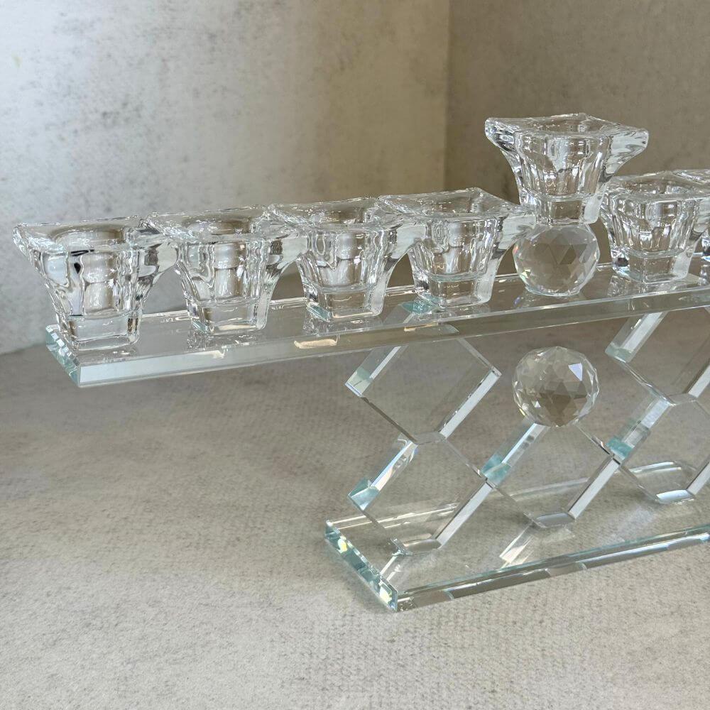 חנוכייה ייחודית בעיצוב גיאומטרי מרהיב, עשויה קריסטל שקוף המשדר יוקרה וניקיון.