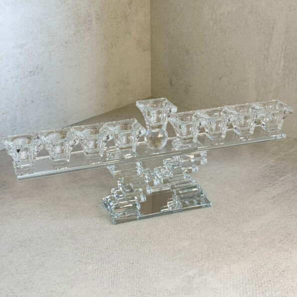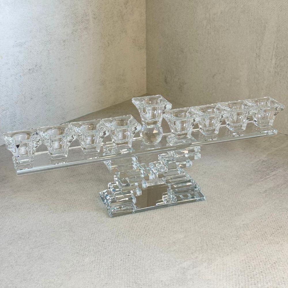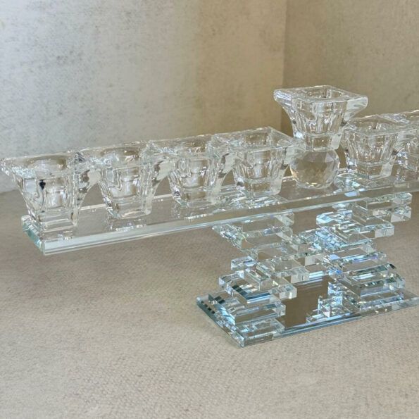 חנוכייה בעיצוב יוקרתי ומודרני, עשויה מקריסטל שקוף בעל גימור מבריק ונקי.