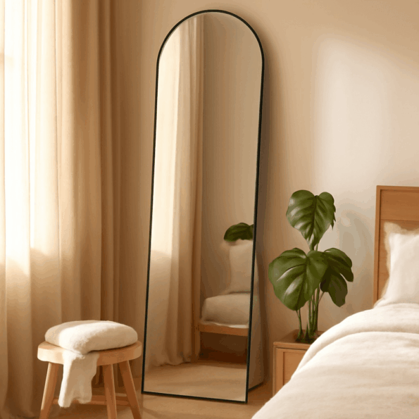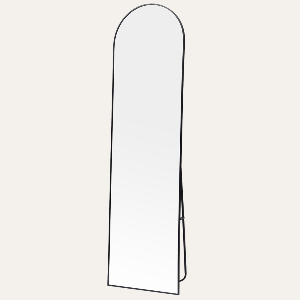 מראת גוף על רגל מסגרת מעוגלת למעלה, מגיעה בצבע שחור, ניתנת גם לתלייה על הקיר.