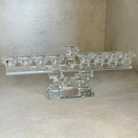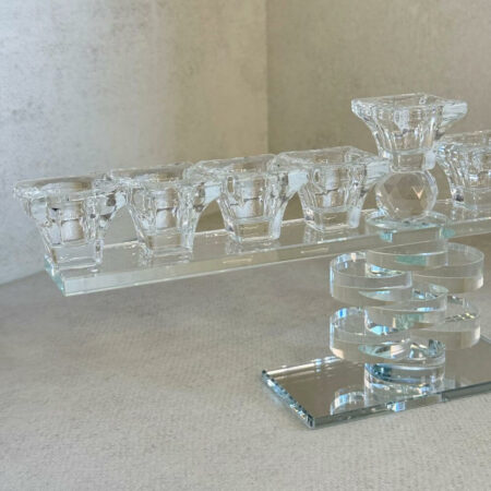 חנוכייה בעיצוב יוקרתי ומודרני, עשויה מקריסטל שקוף בעל גימור מבריק ונקי.